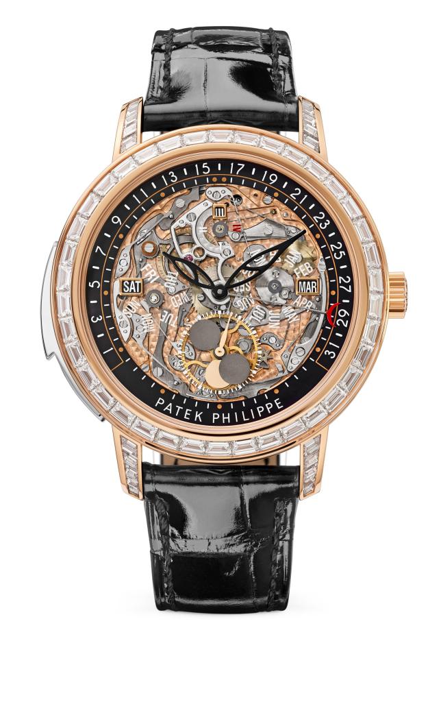 2021” exhibition, the manufacture is presenting six new versions of familiar watch models that were turned into uniquely seductive pieces by gifted artists. The double-face Sky Moon Tourbillon wristwatch (12 complications) combines a manually engraved rose-gold case with a decor in brown grand feu champlevé enamel and a guilloched ornament (Ref. 6002R-001). The Ref. 5304 self-winding grand complication with a minute repeater and a retrograde perpetual calendar now comes in rose gold decorated with 80 baguette diamonds (Ref. 5304/301R-001). The Ref. 5374 grand complication with a minute repeater and a perpetual calendar is joined by a new white-gold version with a blue grand feu enamel dial (Ref. 5374G-001). The current Patek Philippe collection welcomes a new minute repeater for ladies with a dial in blue grand feu flinqué enamel and a bezel with a Flamme® diamond complement (Ref. 7040/250G-001), as well as a new Golden Ellipse Haut Artisanat in white gold with champlevé enamel and manual engraving (Ref. 5738/51). The manufacture also demonstrates its virtuosity in the master jeweler’s art with a new version of the Nautilus Haute Joaillerie in white gold with a random diamond pavé setting, also called snow setting (Ref. 7118/1450G-001).