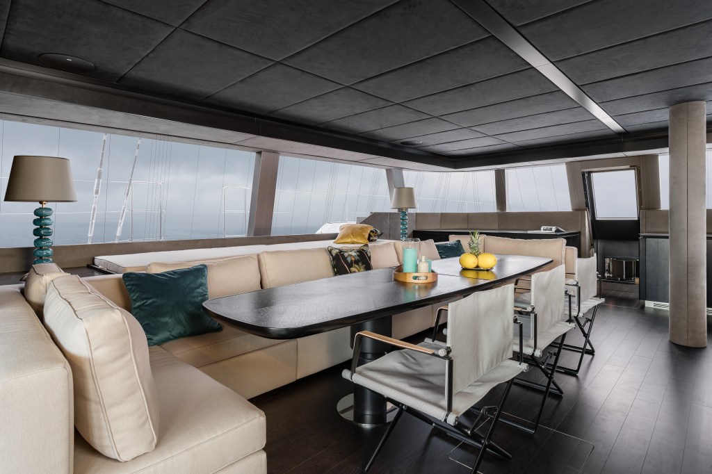 The yacht’s main deck saloon features a lounging space with a large sofa, a wine cooler and a cozy elevated reading spot. The height-adjustable table can also be used as an extra sofa extension. To starboard, the yacht’s main galley provides top kitchen appliances and voluminous storage. Amidships, the kitchen island conceals restaurant quality equipment as well as a retractable TV.