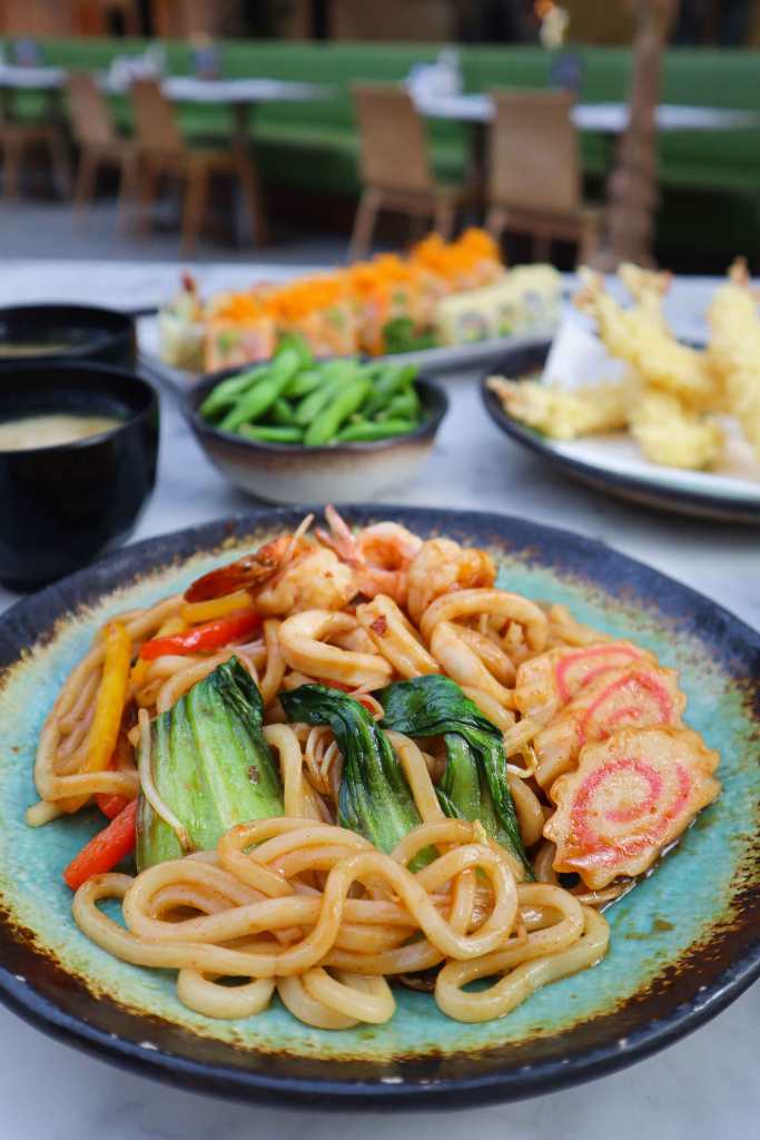 The Ramadan family meal includes three servings of miso soup, yakiudon and salad with edamame and two servings of salmon nigiri and seared garlic salmon. The meal also has four pieces of prawn tempura, crunchy crazy and crunchy California plus eight pieces of sweet potato crunch.